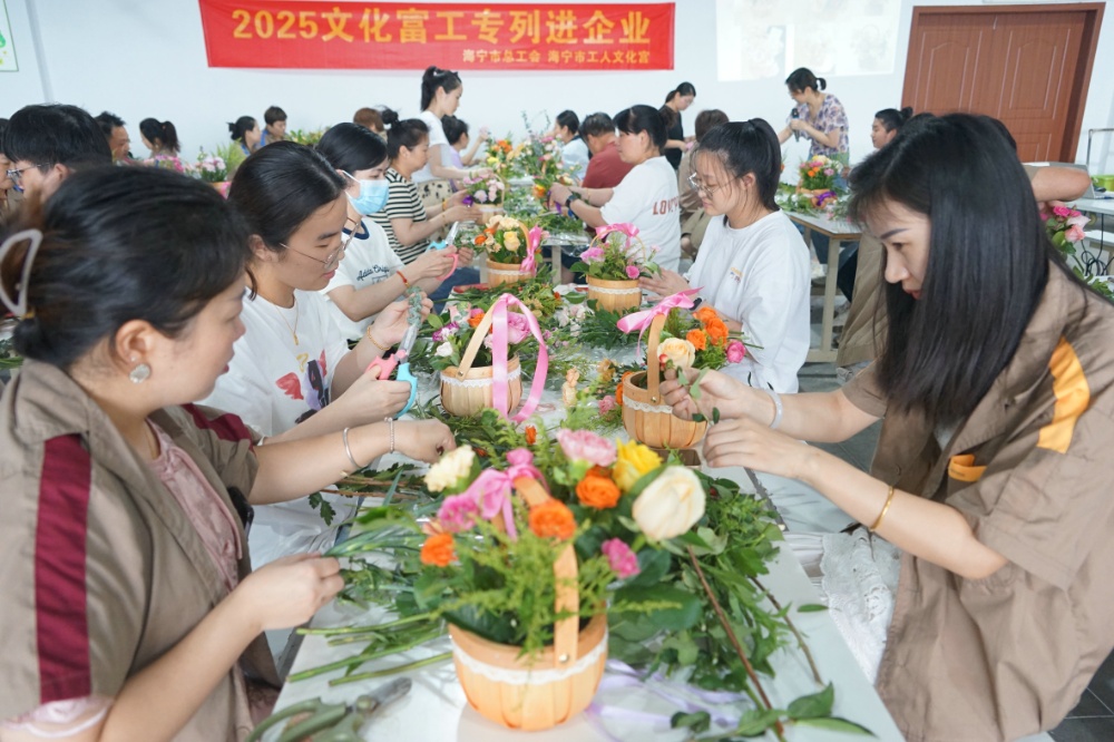 接着是“‘爱在四季•工会有约’公益培训”——插花活动,由专业的插花老师现场授课教学。老师从插花的基本技巧、花材选取、颜色搭配、审美构图等逐一讲授,并同步演示了插花全过程。大家发挥自己的想象,用心构思、精心创作,在一修一剪之间,一件件细致精美、别出心裁的插花作品逐渐呈现,沁人心脾。闻着花香,交流着心得,看着一束束原本普通、零散的花朵变成了精致的艺术作品,每个人的脸上洋溢着满满的成就感和幸福感。