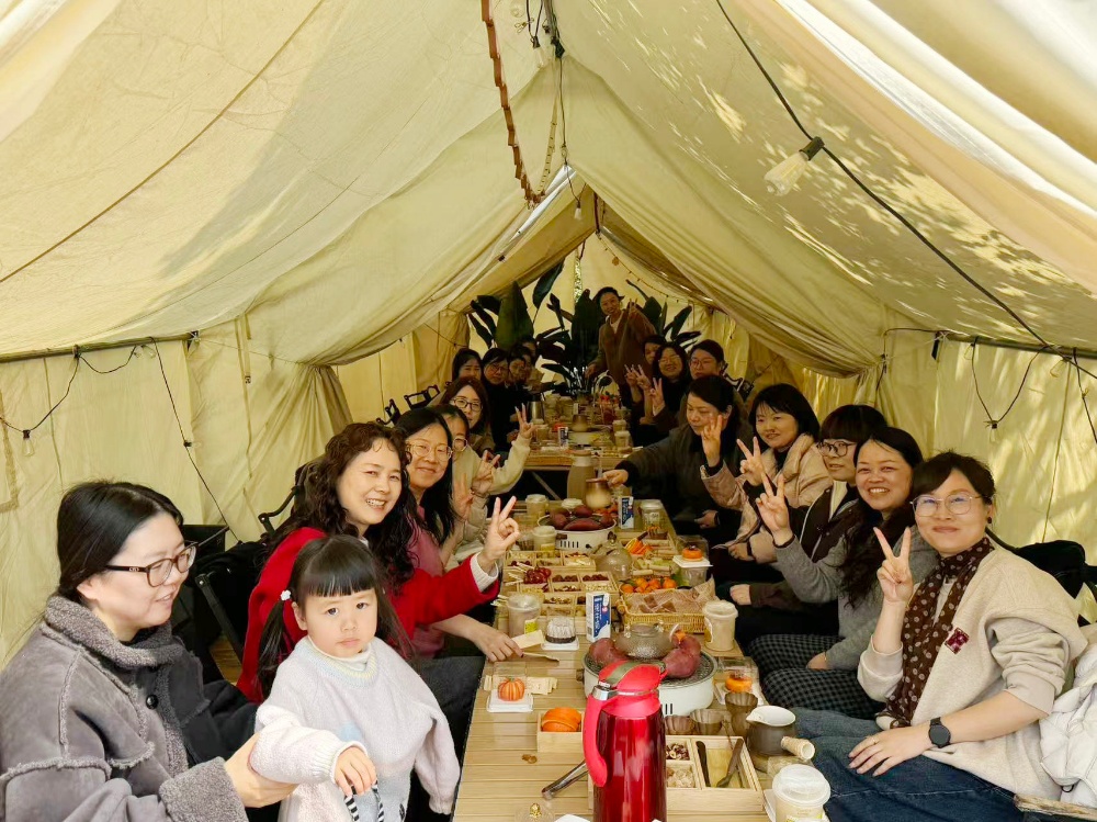 种完多肉,大伙儿围炉煮茶。人手一份小点心,雪梨木耳汤。果盘里还有冰糖小葫芦、坚果、水果等,炉上有茶和烤红薯。放下繁忙的工作与生活,围在一起聊聊天,谈谈心,举杯共饮,享受这一刻最真实的悠闲与快乐。
